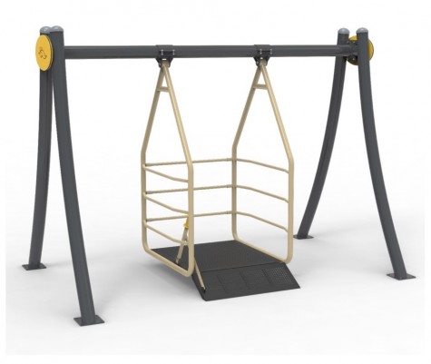 Balançoire haut de gamme adaptée aux fauteuils roulants. L’utilisateur peut monter en façade et se balancer en se servant des cordes pour s'élever et s'arrêter. La cabine du fauteuil roulant dispose d’espace suffisant pour un passager de plus.