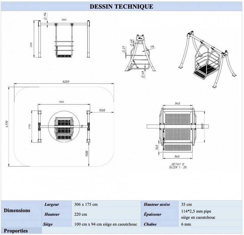 Aire de sécurité : 6,20 x 5,00 m (Longueur x largeur).
