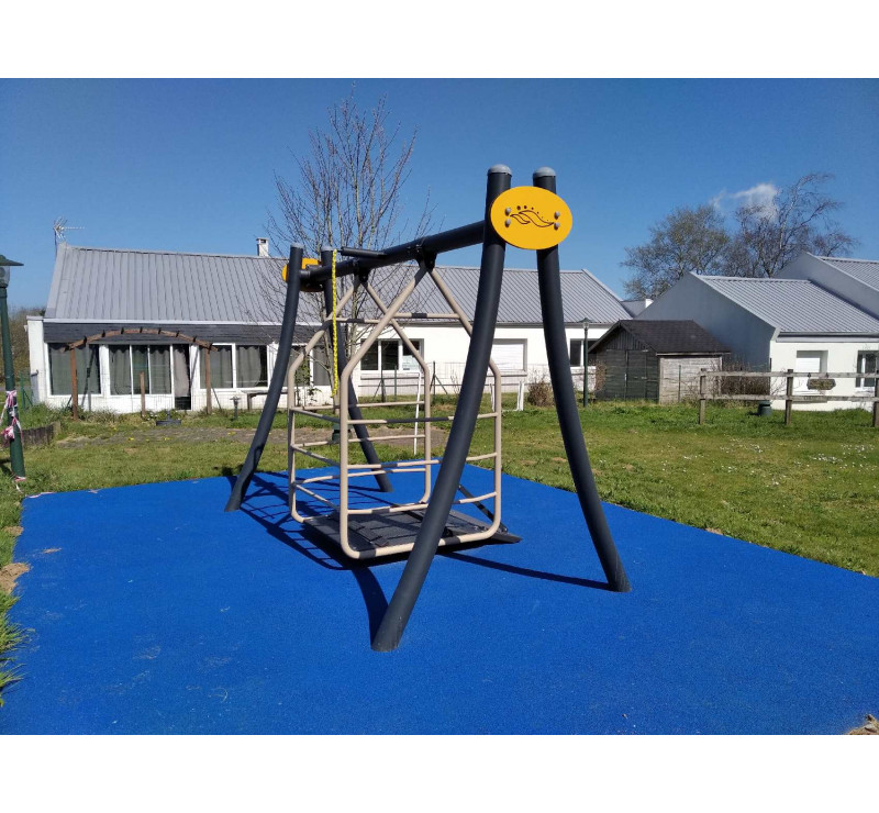 Portique-balançoire PMR renforcé avec entrée du fauteuil roulant très pratique : le fauteuil rentre tout droit.